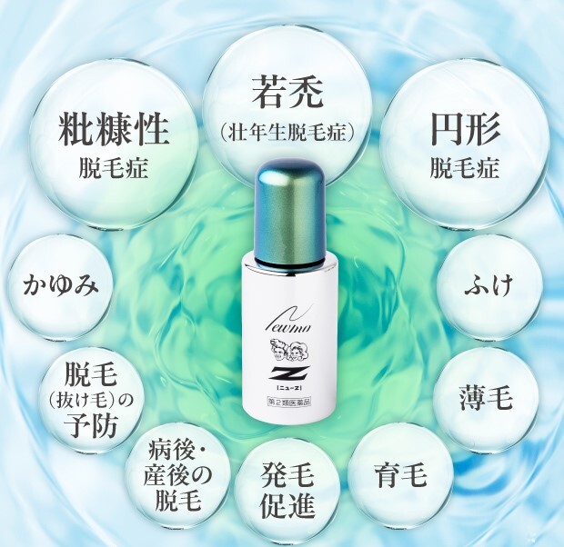 ※1 見た目のこと※2 効能効果:発毛促進、育毛、脱毛(抜毛)の予防、若禿(壮年性脱毛症)、薄毛、ふけ、かゆみ、病後・産後の脱毛、粃糠性脱毛症、円形脱毛症。また、男性型脱毛症(AGA)は壮年性脱毛症とも呼ばれる