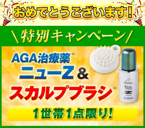 ※1 効能効果:発毛促進、育毛、脱毛(抜毛)の予防、若禿(壮年性脱毛症)、薄毛、ふけ、かゆみ、病後・産後の脱毛、粃糠性脱毛症、円形脱毛症。また、男性型脱毛症(AGA)は壮年性脱毛症とも呼ばれる ※2 スカルプブラシのプレゼントは定期初回限定。プレゼントは変更になる場合がございます